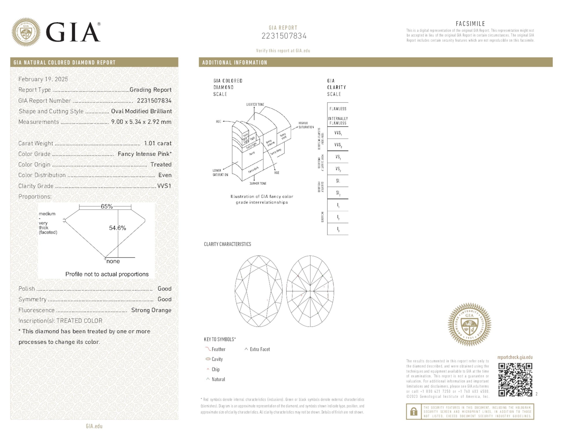 · Main stone 1.01 ct oval shape Fancy Intense Pink (treated color)