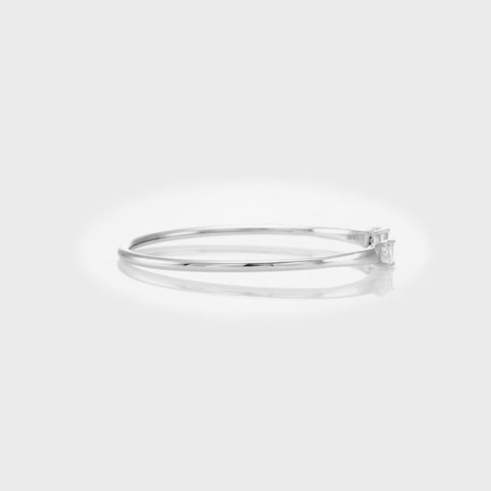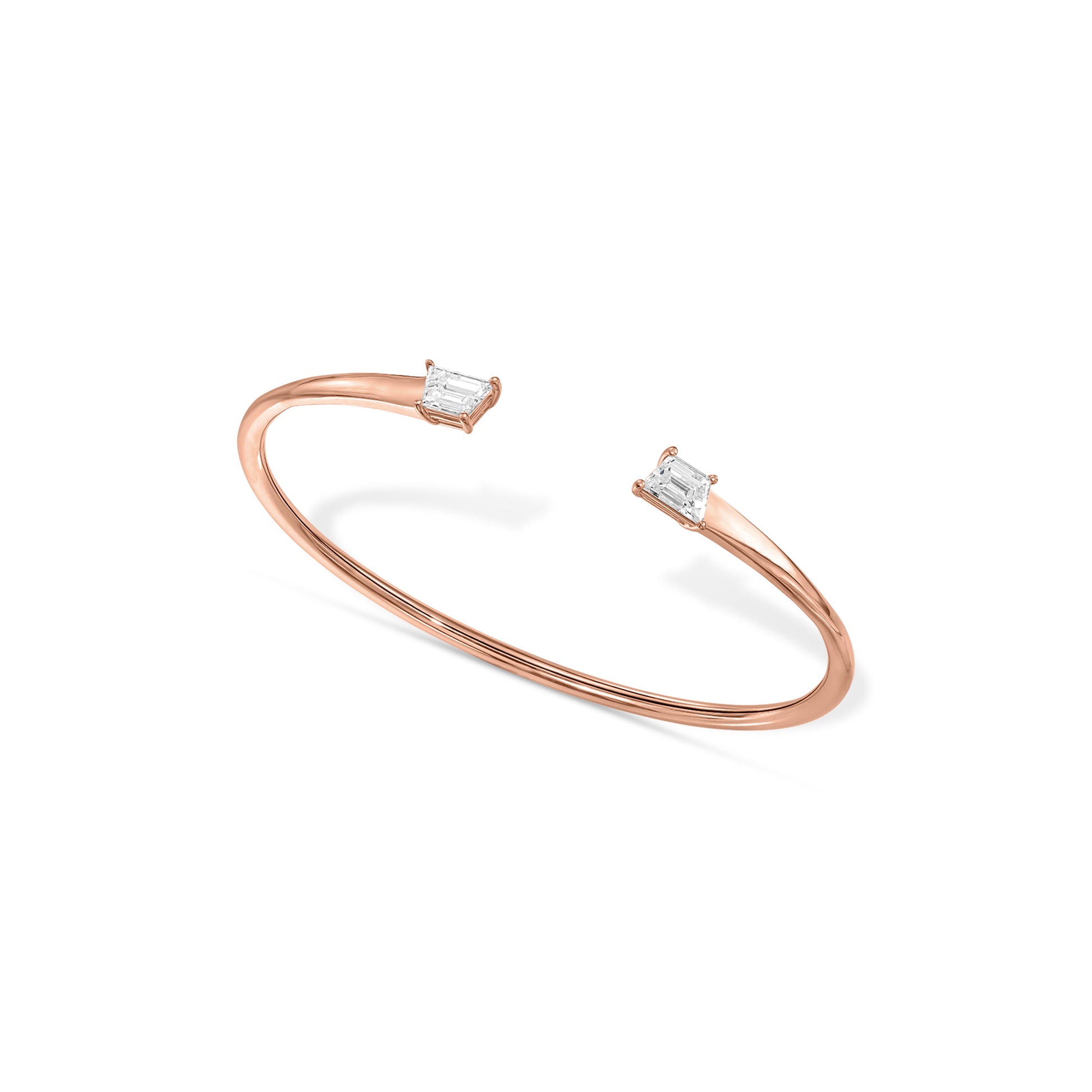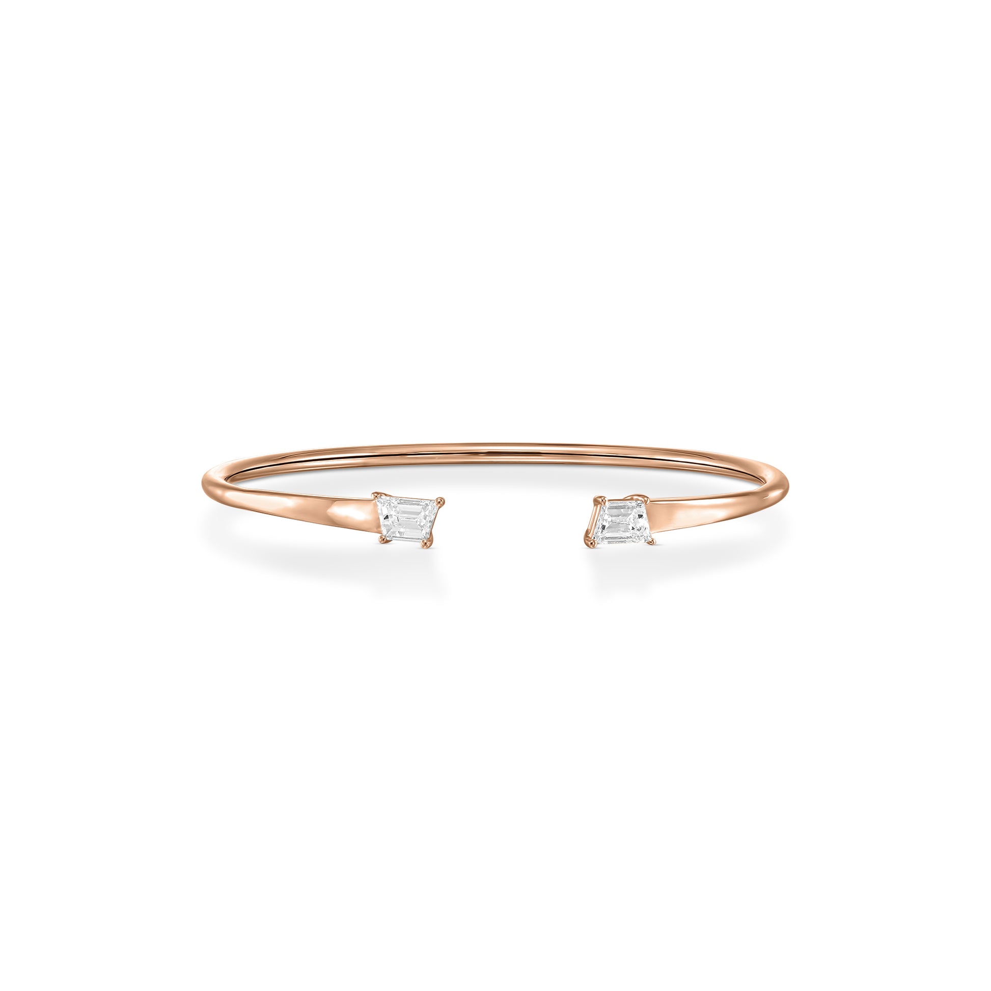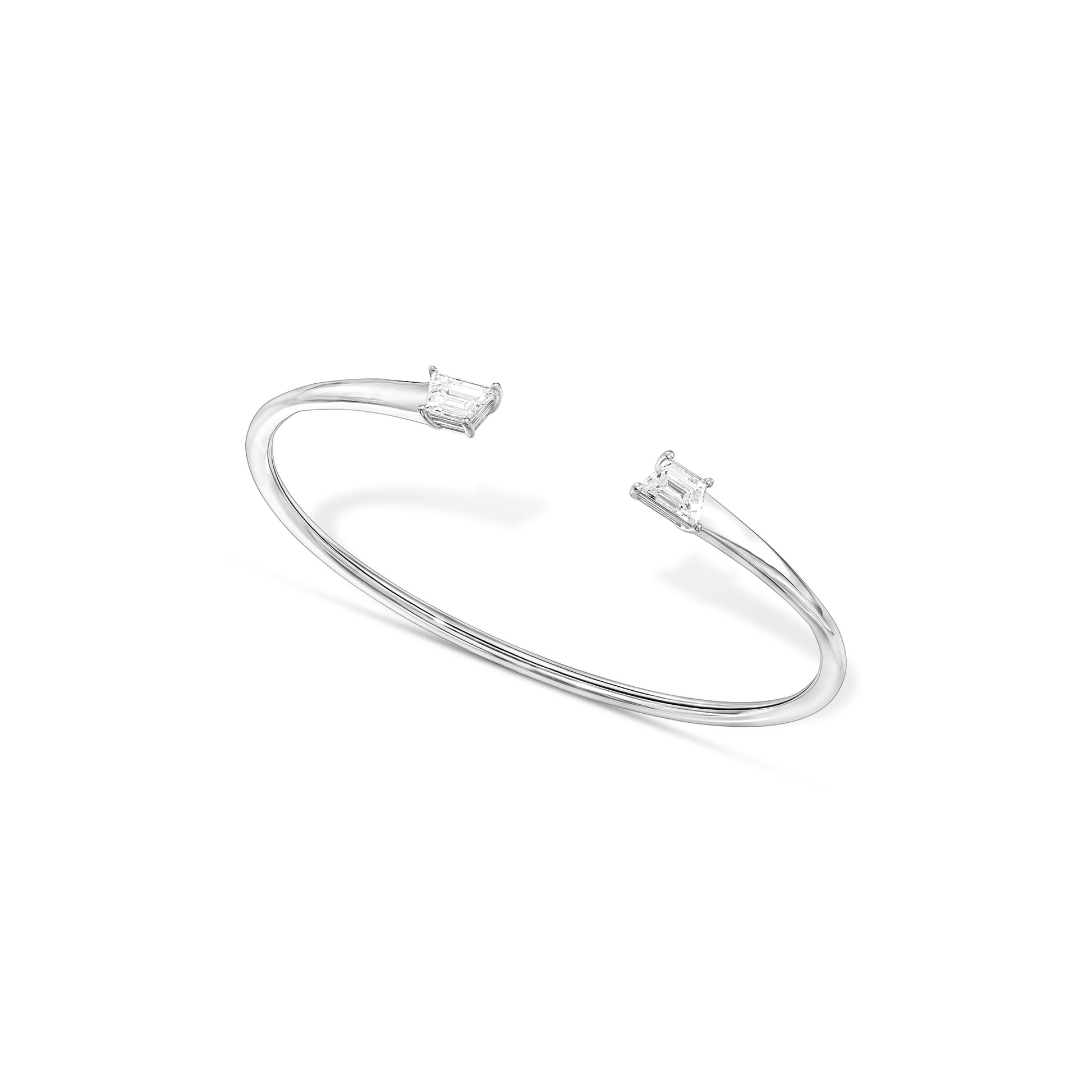 A beautiful 18K white gold bangle featuring two exquisite trapeze-shaped diamonds — a 0.58ct E color, VVS2 clarity stone and a 0.56ct F color, VS1 clarity stone. This elegant and modern design showcases perfect symmetry and timeless brilliance.