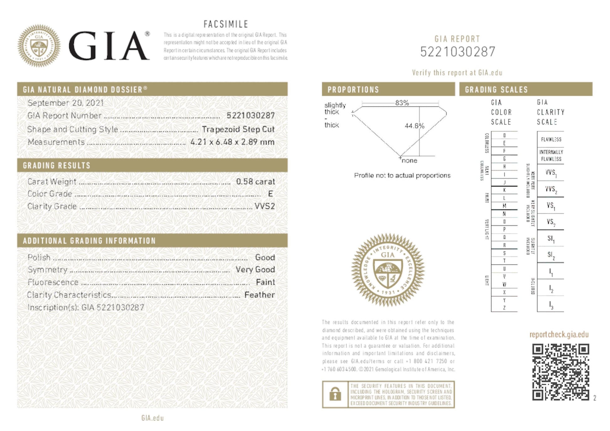 - Stone #1: 0.58ct trapeze cut, E color, VVS2 clarity, GIA certificate number 5221030287