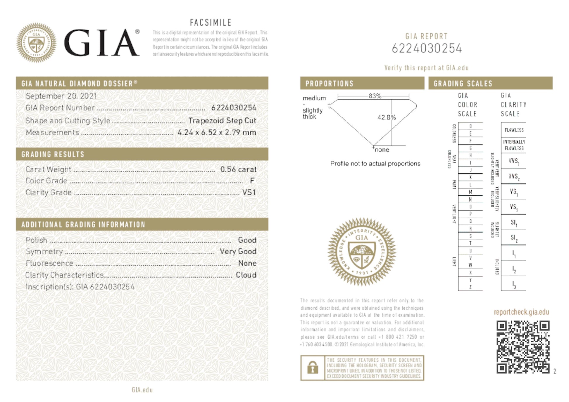 - Stone #2: 0.56ct trapeze cut, F color, VS1 clarity, GIA certificate number 6224030254