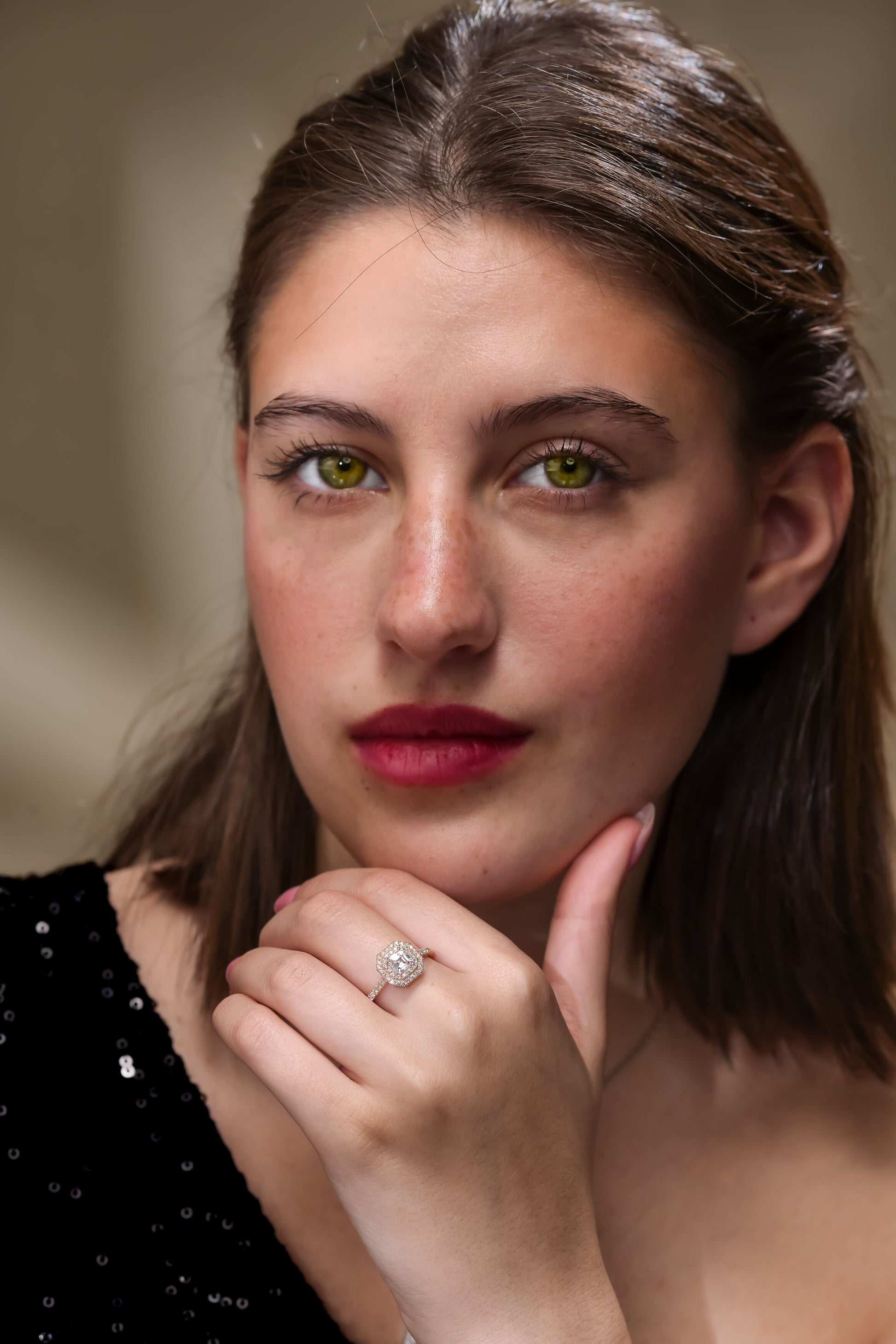 - Set in: 18K Rose Gold surrounded by Round natural diamonds total weight of 0.35ct F+ color VS+ clarity.