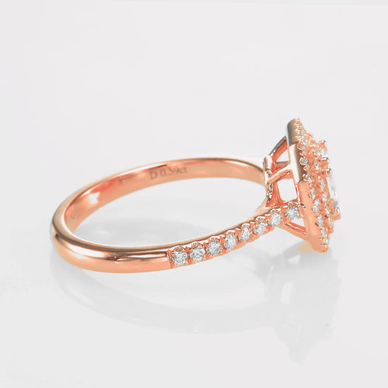 A beautiful 18K Rose Gold Ring in size 6.5. The center stone is 0.59ct Asscher Square Emerald Cut Cut I Color VVS1 Clarity