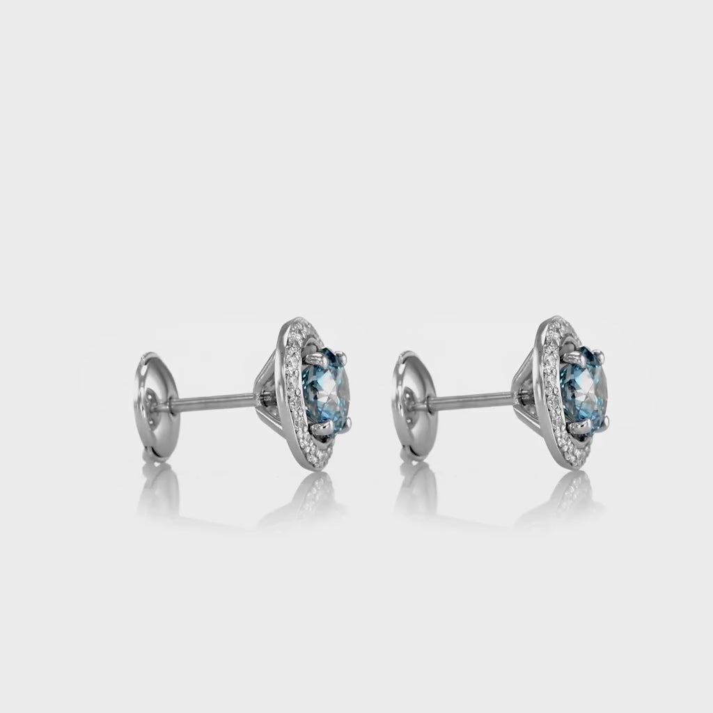 A beautiful 2.11ct Vivid Green -Blue Round natural diamonds in 18k white gold halo studs earrings