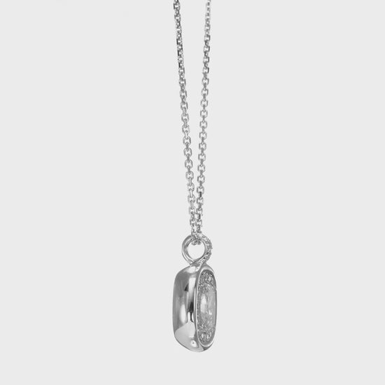 A beautiful 18K white gold pendant necklace featuring a 0.87ct cushion-cut main diamond, F color, and VVS2 clarity, accented with sparkling round side diamonds totaling 0.14ct.