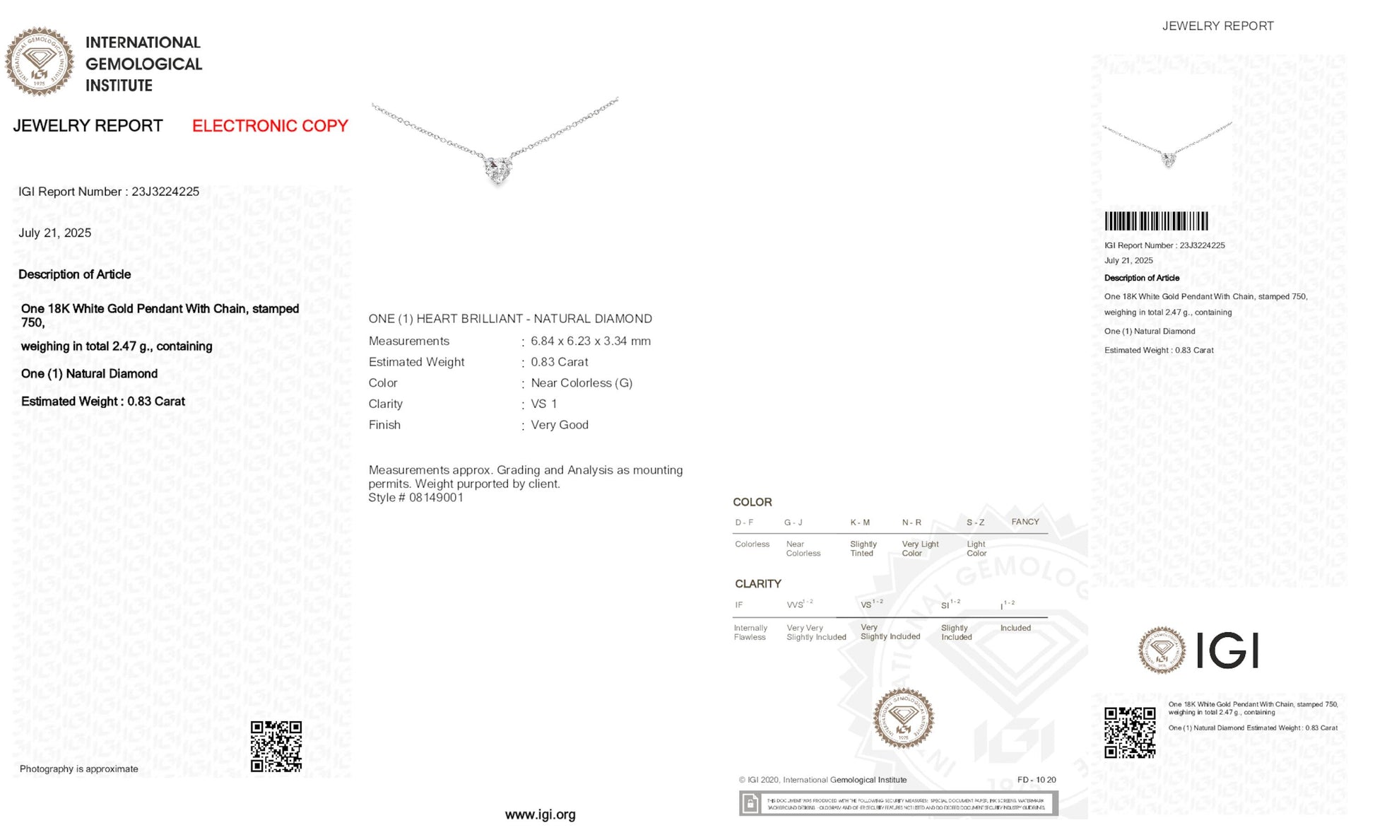 - Main stone: 0.83arat Heart shape G Color VS1 Clarity, with IGI certificate