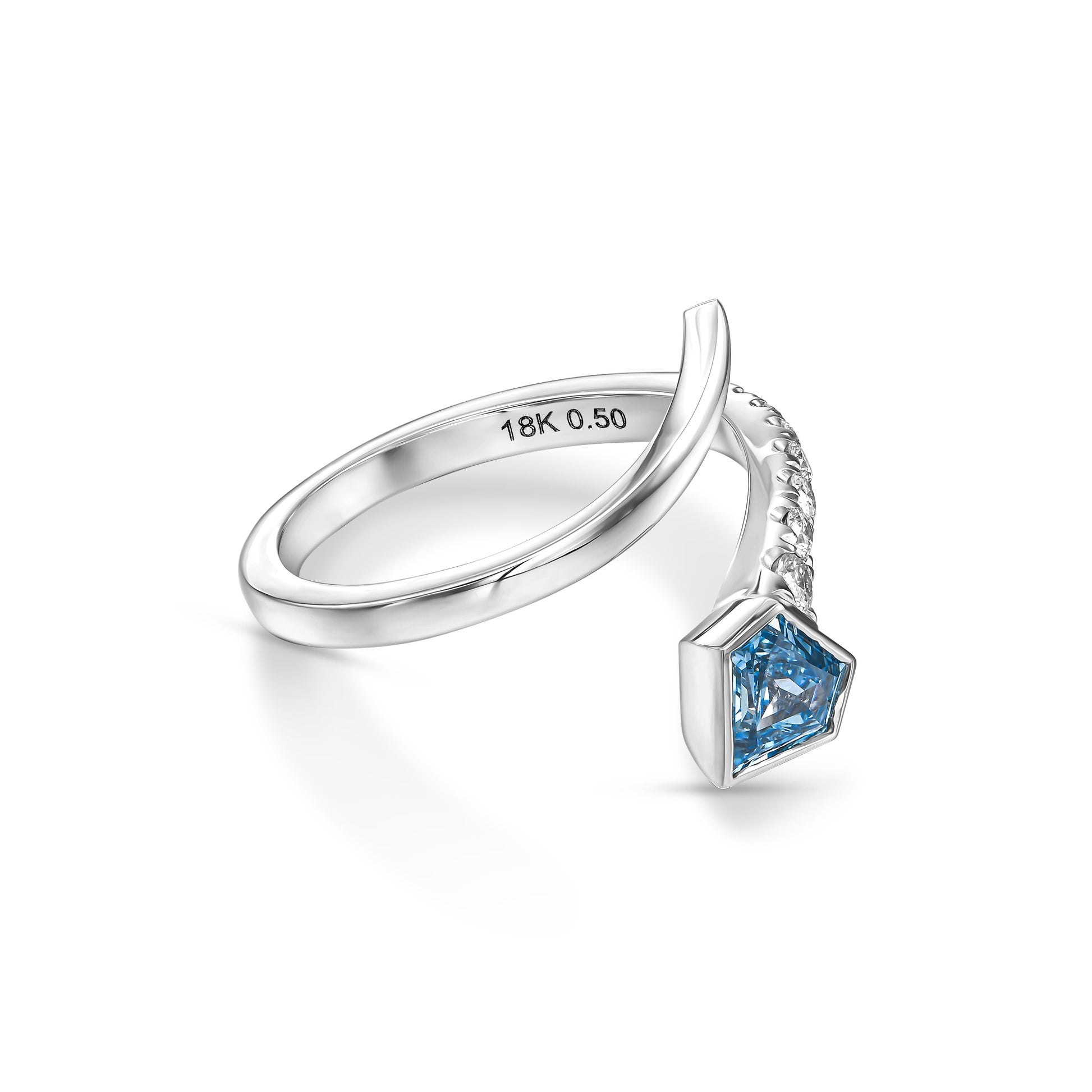 A beautiful 0.50 ct Fancy Vivid Greenish Blue Shield (treated color) in a 18k White Gold Statement Ring
