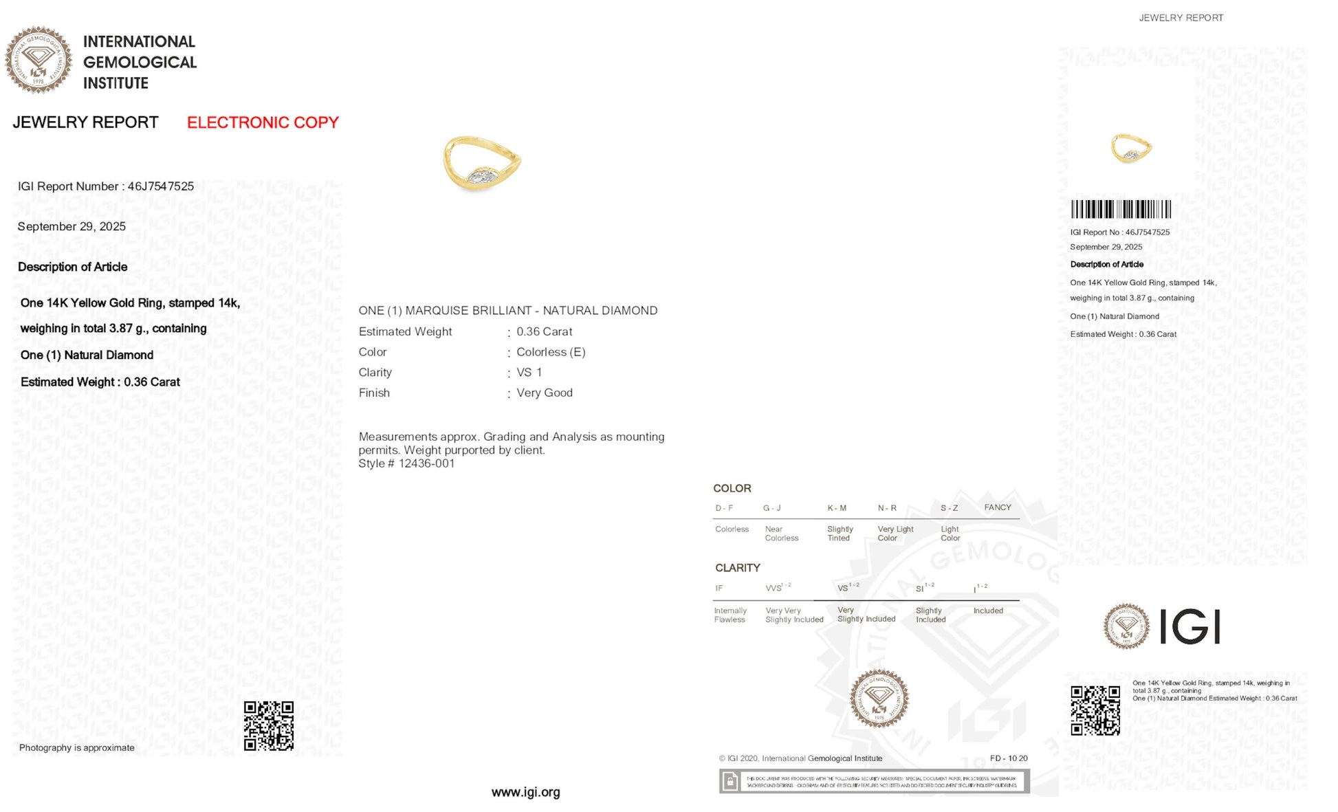 - Main stone: 0.36ct marquise cut, E color, VS1 clarity